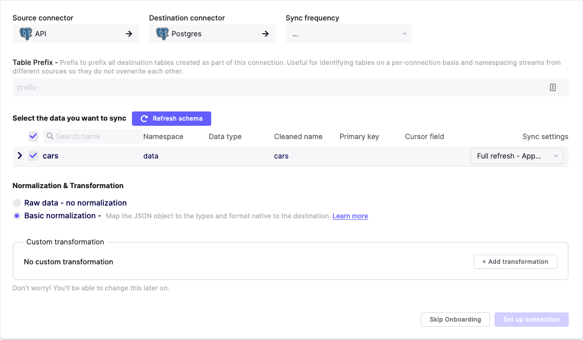 To enable basic normalization (which is optional), you can toggle it on or disable it in the "Normalization and Transformation" section when setting up your connection: